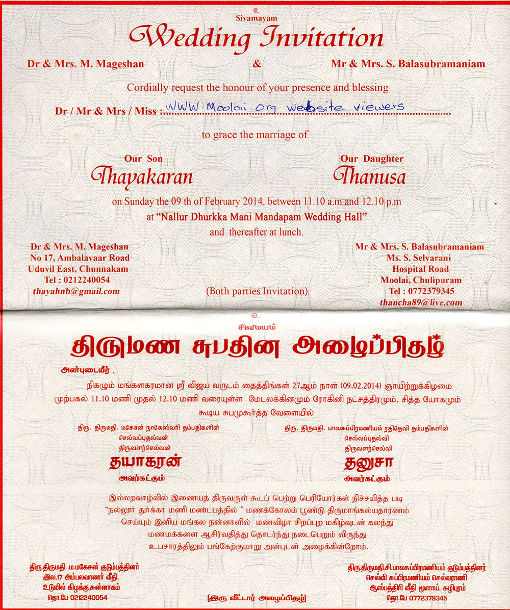 Moolai's Thanusa joins hands with Thayakaran on Sunday the 9th of February 2014. This matrimonial ceremony takes place at Nallur Dhurkka Mani Mandapam Wedding Hall, between the auspicious hours of 11:10AM and 12:10PM.
